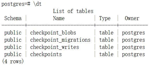 可以看到,记忆已经被保存了。我们检查数据库可以发现,postgres数据库中出现了四个表: