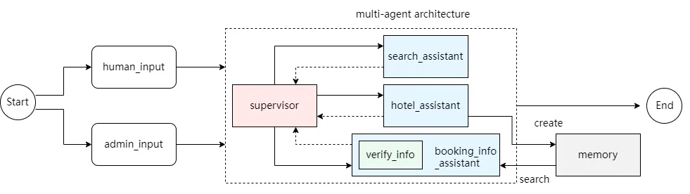 5.当supervisor选择调用booking_info_assistant,会先进行verify_info,中断图的执行以请求管理员ID,当输入管理员ID后,接着判断管理员ID是否符合要求,如果不符合,那么不进行记忆查询,如果符合,则查询记忆,并返回。