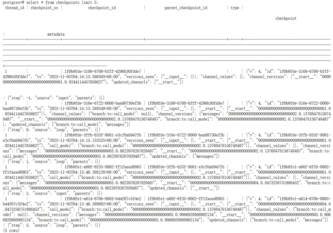 上述表中,checkpoints表是”状态快照“表,每当程序执行一个step时,它就会在这张表中创建一条新记录,这条记录就是一个检查点的快照。查询该表,可以得到如下结果: