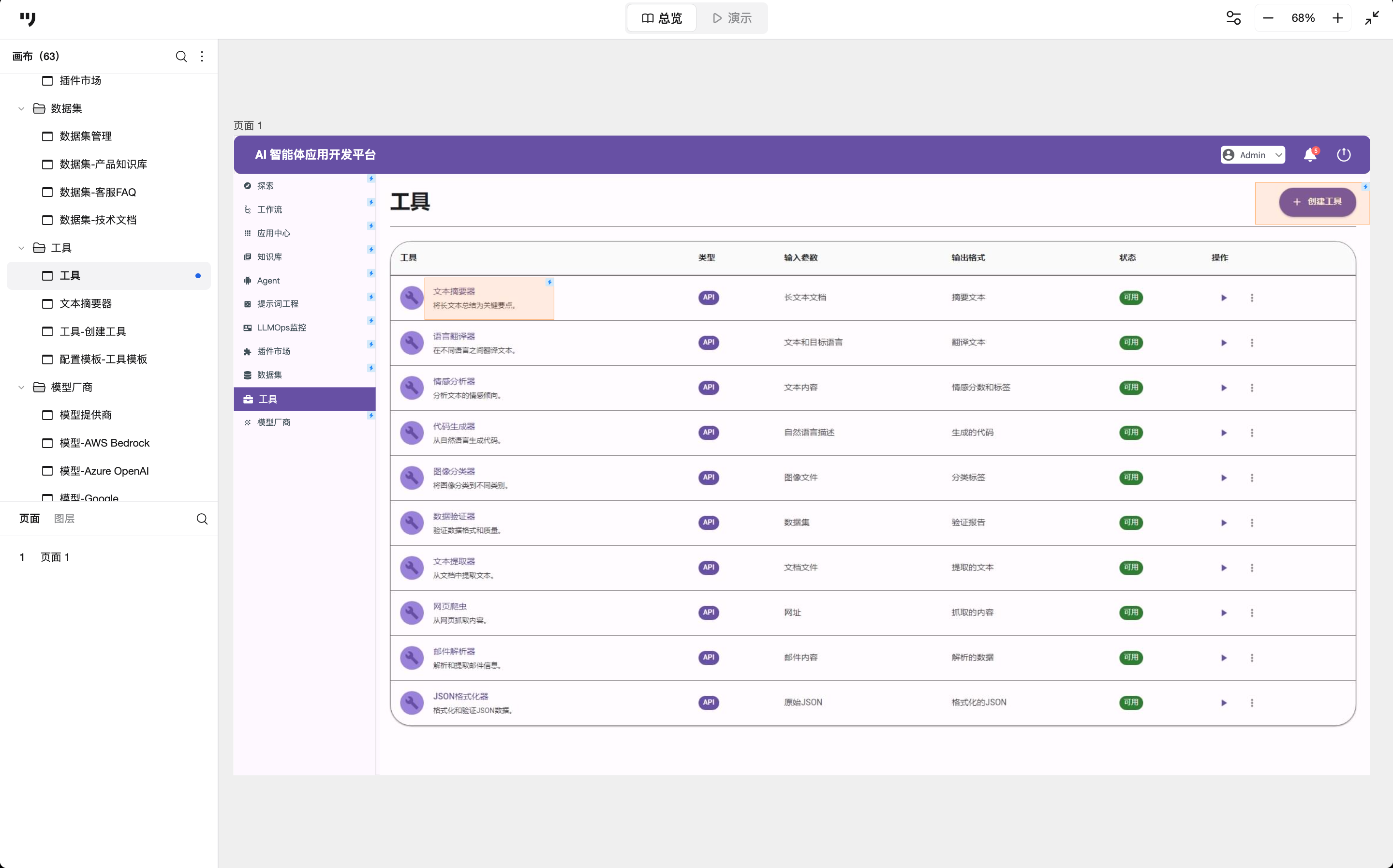 区别于外部插件,这里更多是系统级或自定义的函数工具。在列表中展示工具的类型(API)、输入参数要求和输出格式,以及明显的状态。支持操作暂停开关。