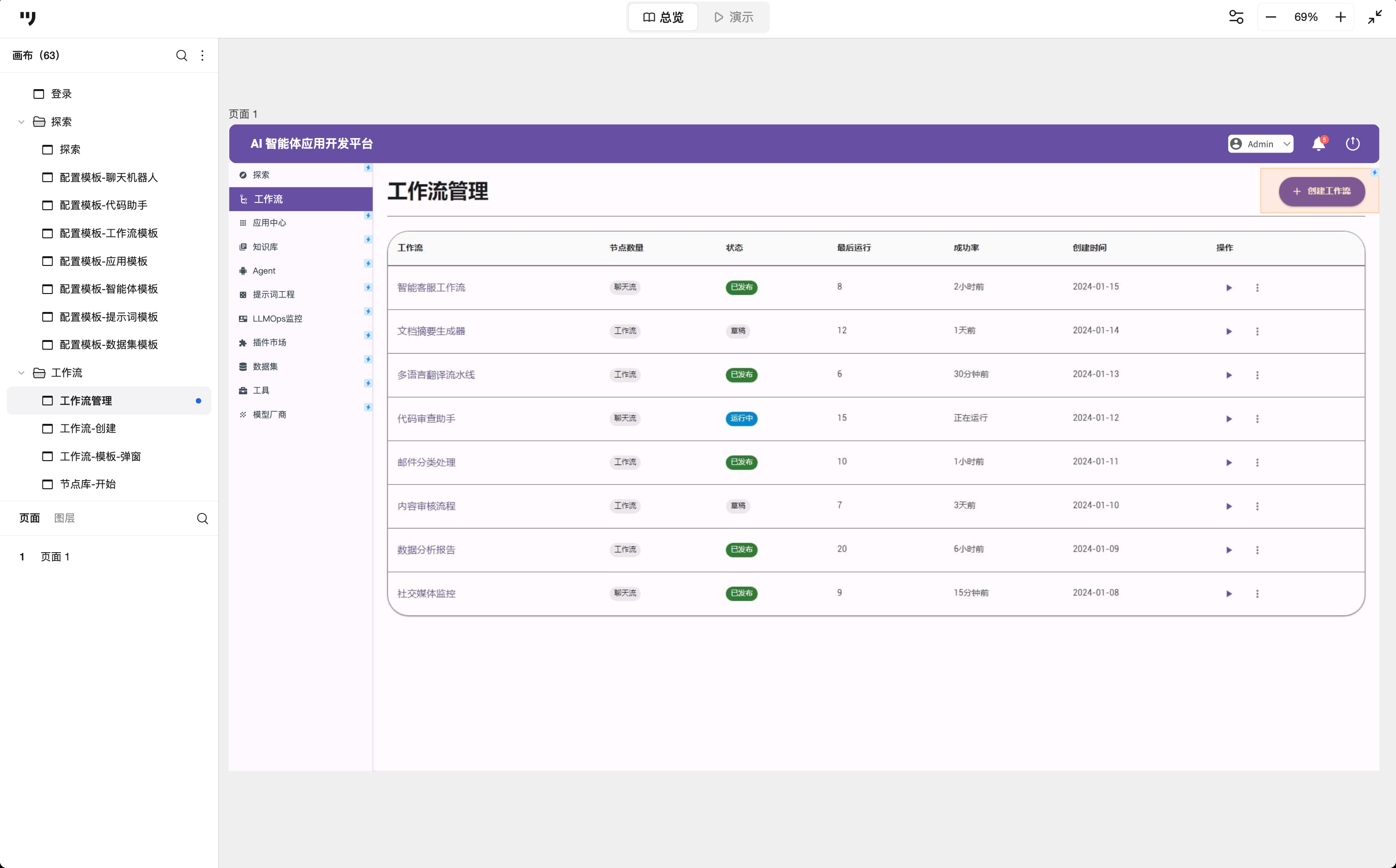 在工作流列表页,字段设计明显偏运维视角,强调“节点数量”、“状态(已发布/草稿)”和“成功率”。这些字段可以让开发者第一眼就能判断哪个流程有风险,哪个需要排查。