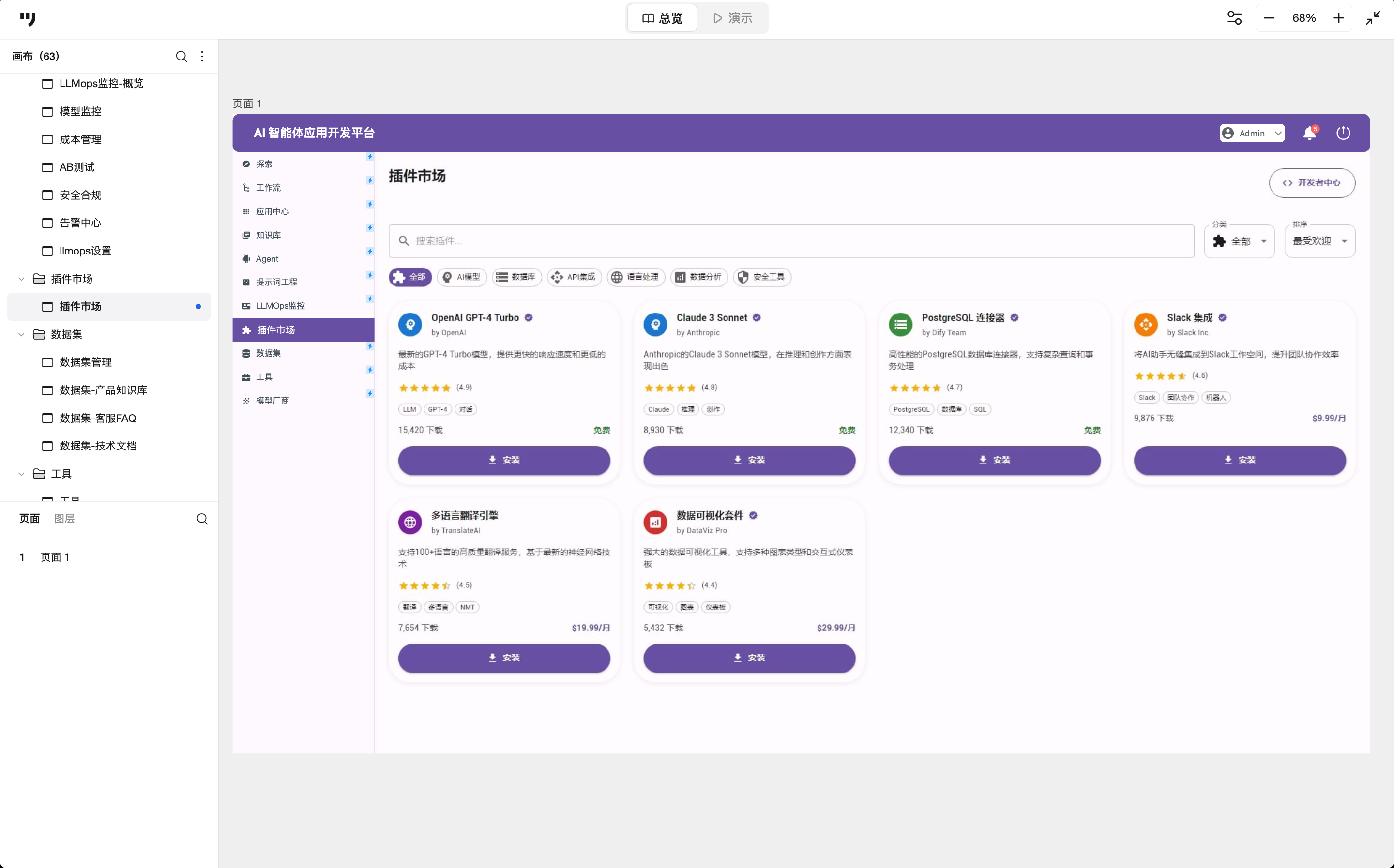 插件市场是AI的能力扩展中心,连接外部SaaS生态。这里用应用商店模式,用卡片形式展现插件信息,Logo+名称+一句话描述。分类清晰,设有AI模型、数据库、API集成、语言处理、数据分析、安全工具等分类导航。