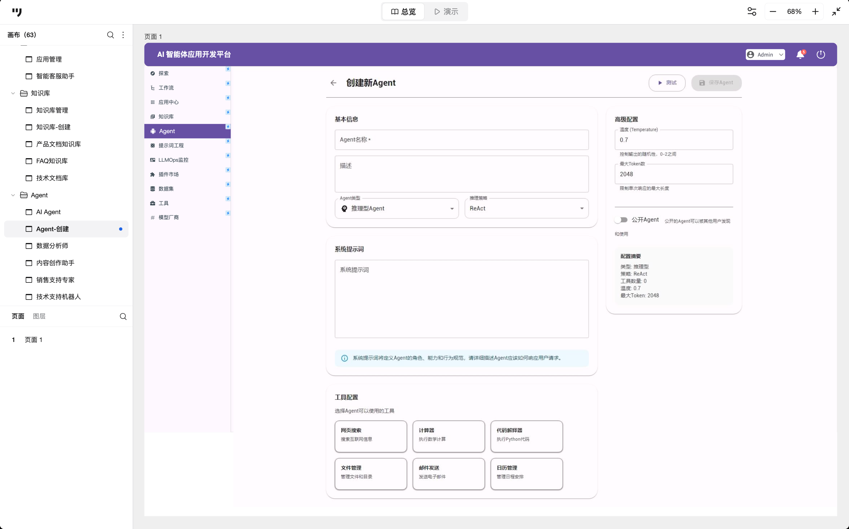 - 左侧为主配置区:上部定义基础身份,中部通过“系统提示词”注入灵魂(定义角色与规范),下部“工具配置”赋予其实际操作能力(如联网搜索、代码解释器)。