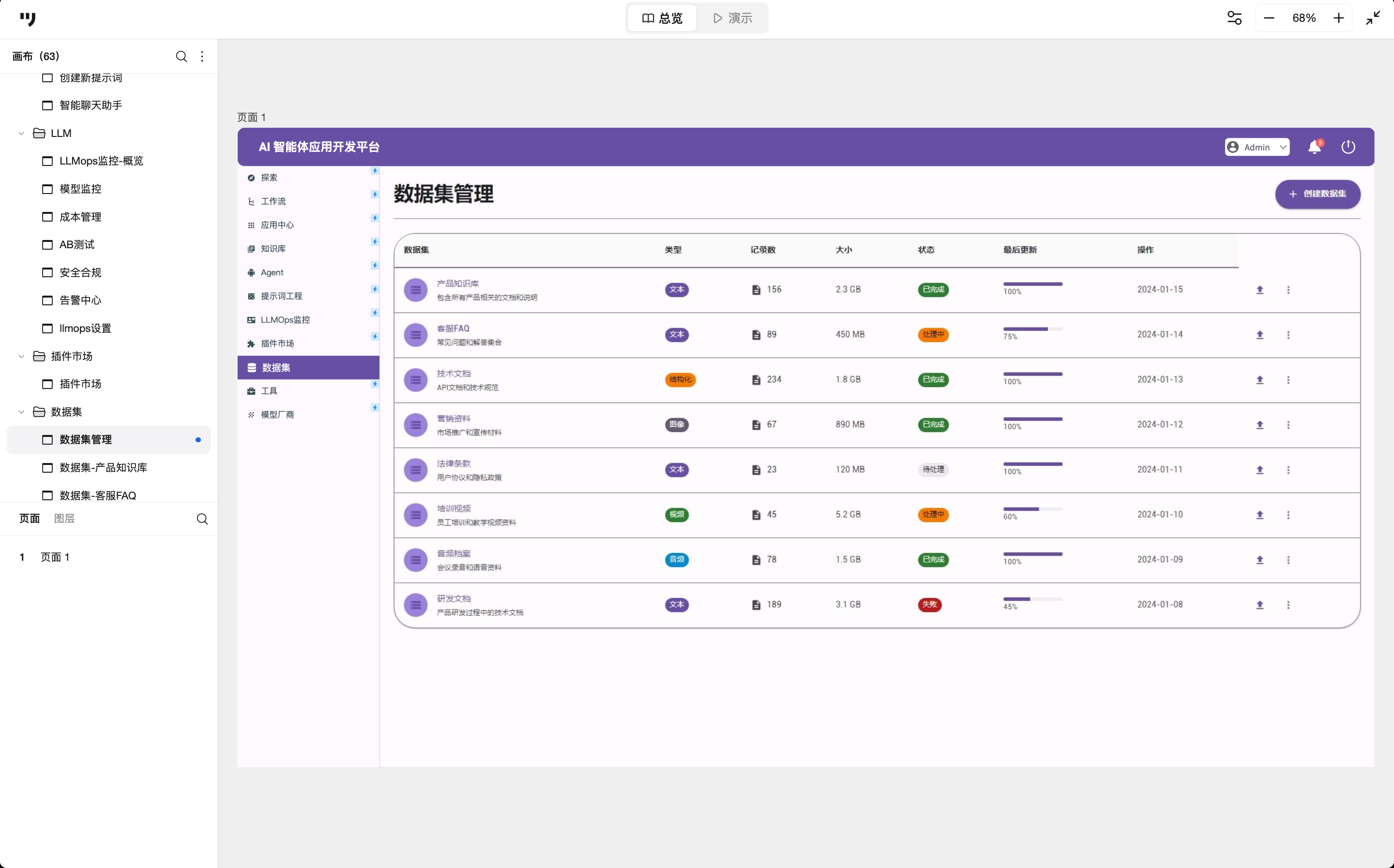 在“最后更新”列中巧妙地嵌入了百分比进度条。因为处理大规模非结构化数据(如解析视频、清洗清洗)通常是耗时的异步任务,进度条设计能有效缓解用户的等待焦虑。