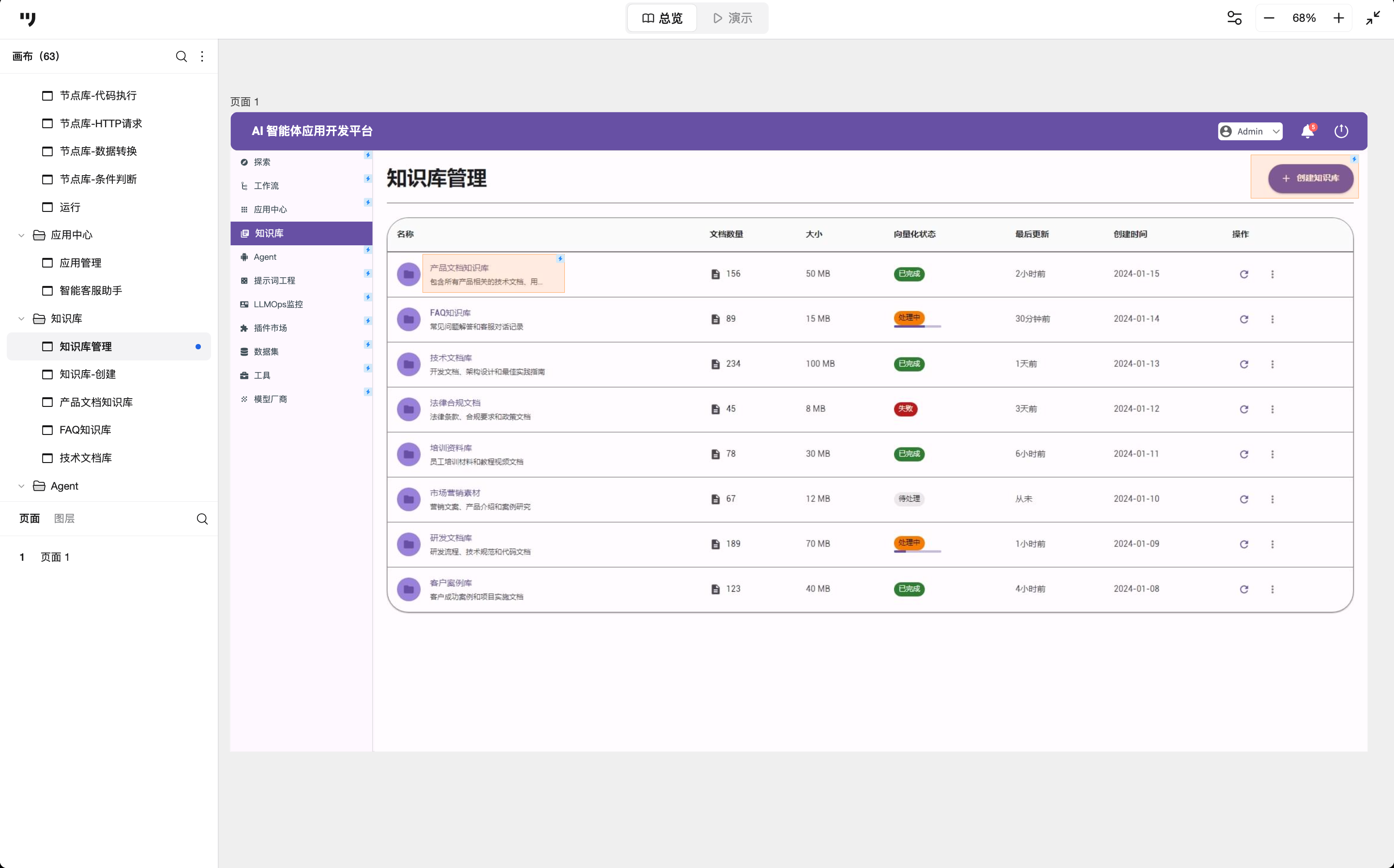 知识库模块是RAG架构的核心,在设计上,采用数据化列表,重点展示“文档数量”、“大小”和最重要的“向量化状态”。使用不同颜色的标签(如绿色-已完成、橙色-处理中、红色-失败)展示处理进度,点击知识库名称可以查看文档详情。