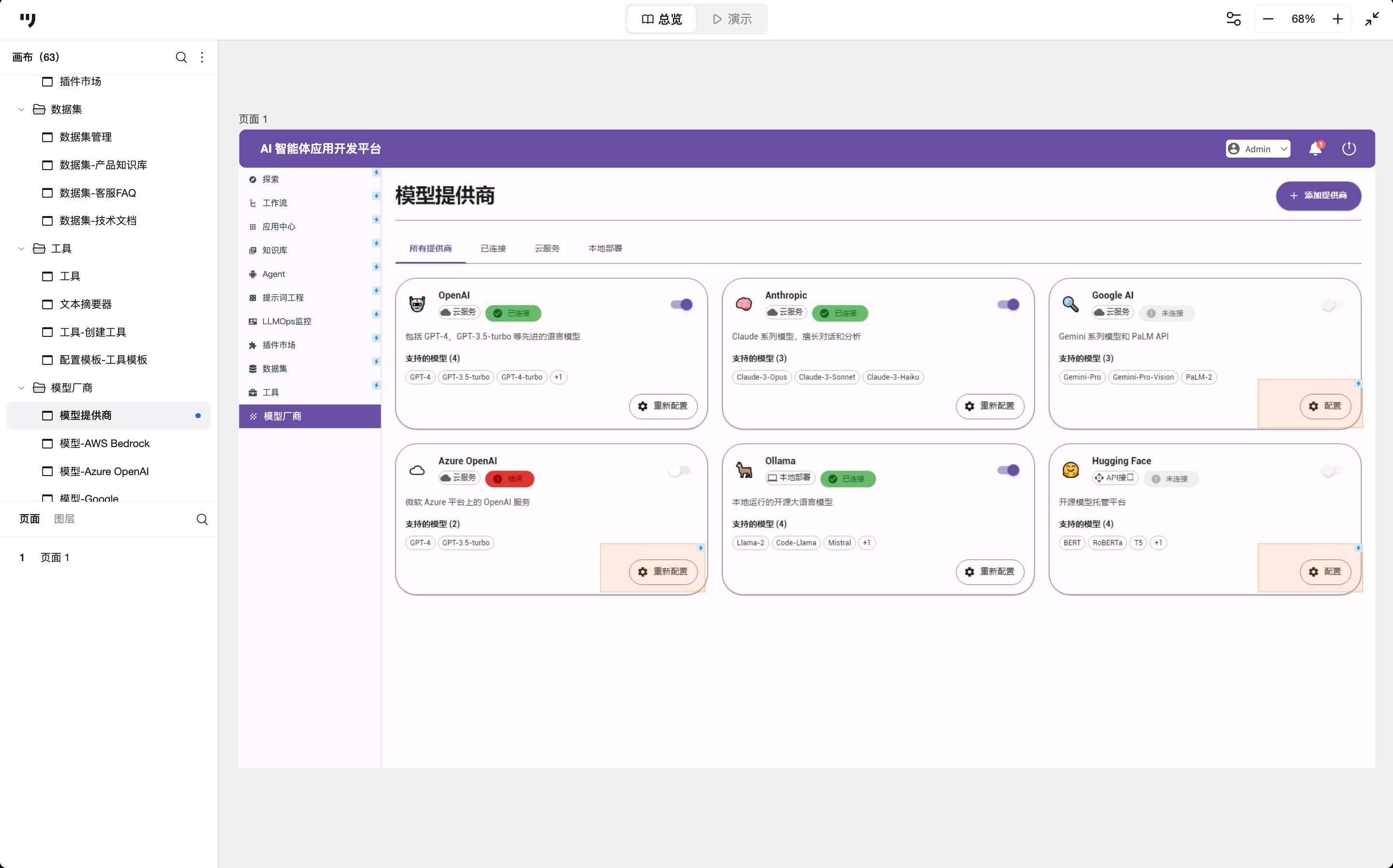 在模型厂商页面,展示模型提供商,分为4个Tab分类:所有提供商、已连接、云服务和本地部署。在这个页面厂商聚合展示,将OpenAI、Anthropic、Google等主流厂商及本地模型(Ollama)以卡片形式展现出来,设有分类标签与连接状态。点击重新配置,可以进入详细配置页。
