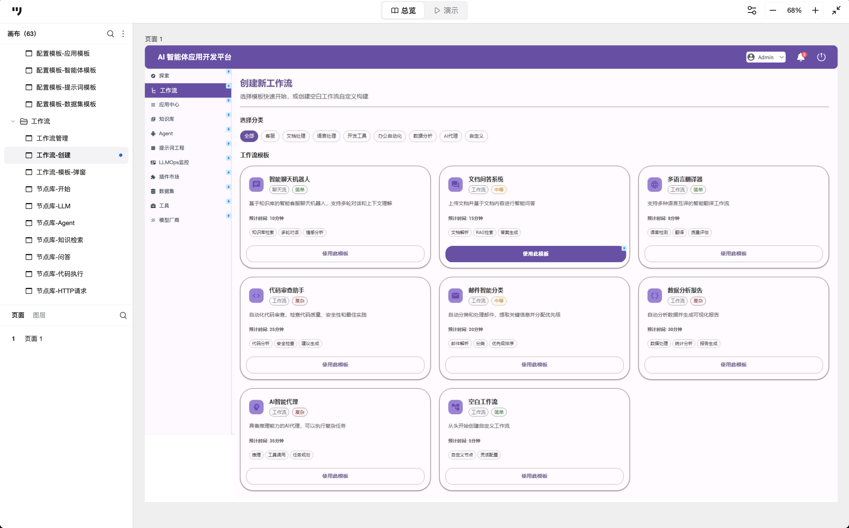 在创建工作流页面,并没有直接进入空白画布,而是提供了场景化引导(如智能客服、文档问答、数据分析)。采用分步引导模式,像RAG、多步执行、多模型协作这种原本偏后端的能力,被直接包进模板里,用户其实感觉不到这些差异。
