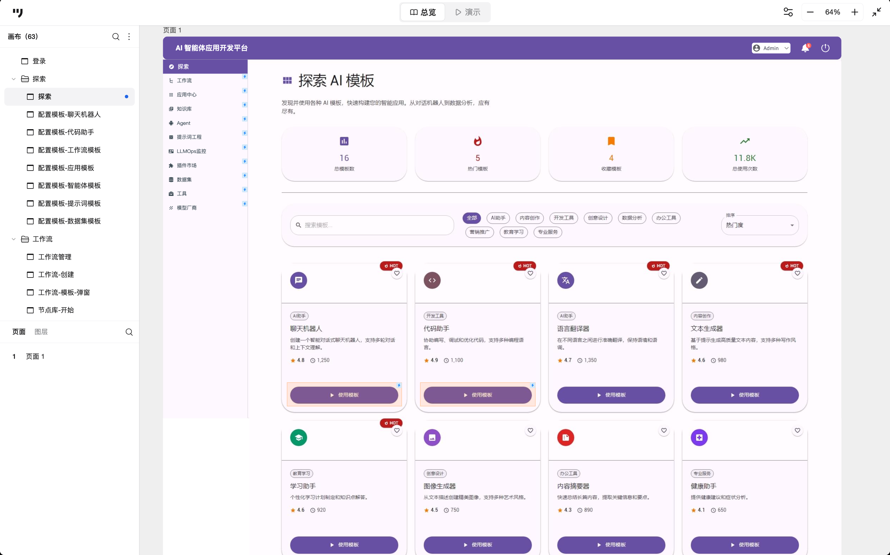 探索页是平台的“应用商店”或者“模板市场”,主要为了降低用户第一次上手AI Agent开发平台的心理门槛。在探索主页,顶部直接展示总模版数、热门模板数、收藏数等关键KPI,这类数据放在首页,是先告诉新用户:这个平台不是空的,有人在用。