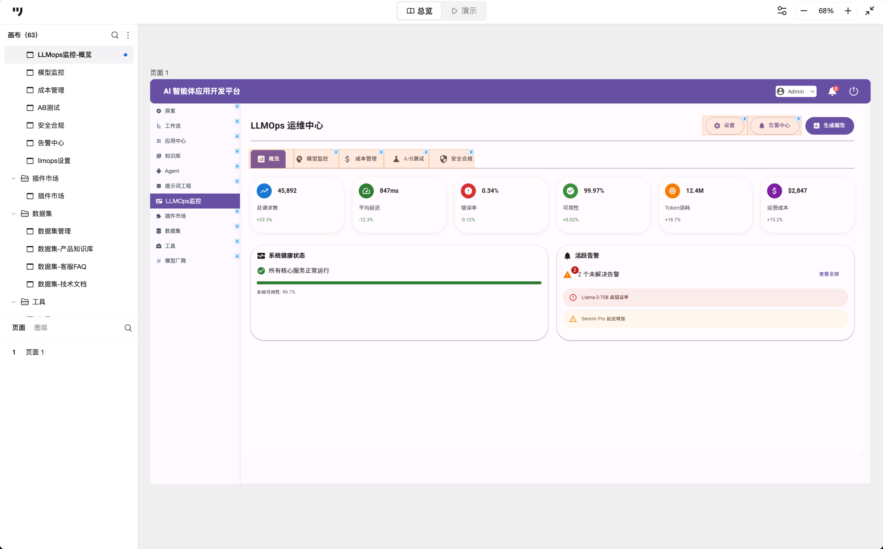 LLMOps运维中心是AI应用的生产仪表盘,用户在这里可以关注稳定性与成本。它分为概览、模型监控、成本管理、A/B测试、安全合规5个Tab。以概览页面为例: