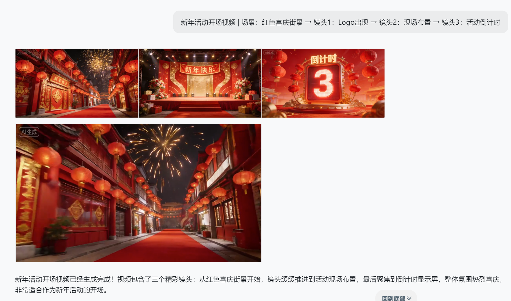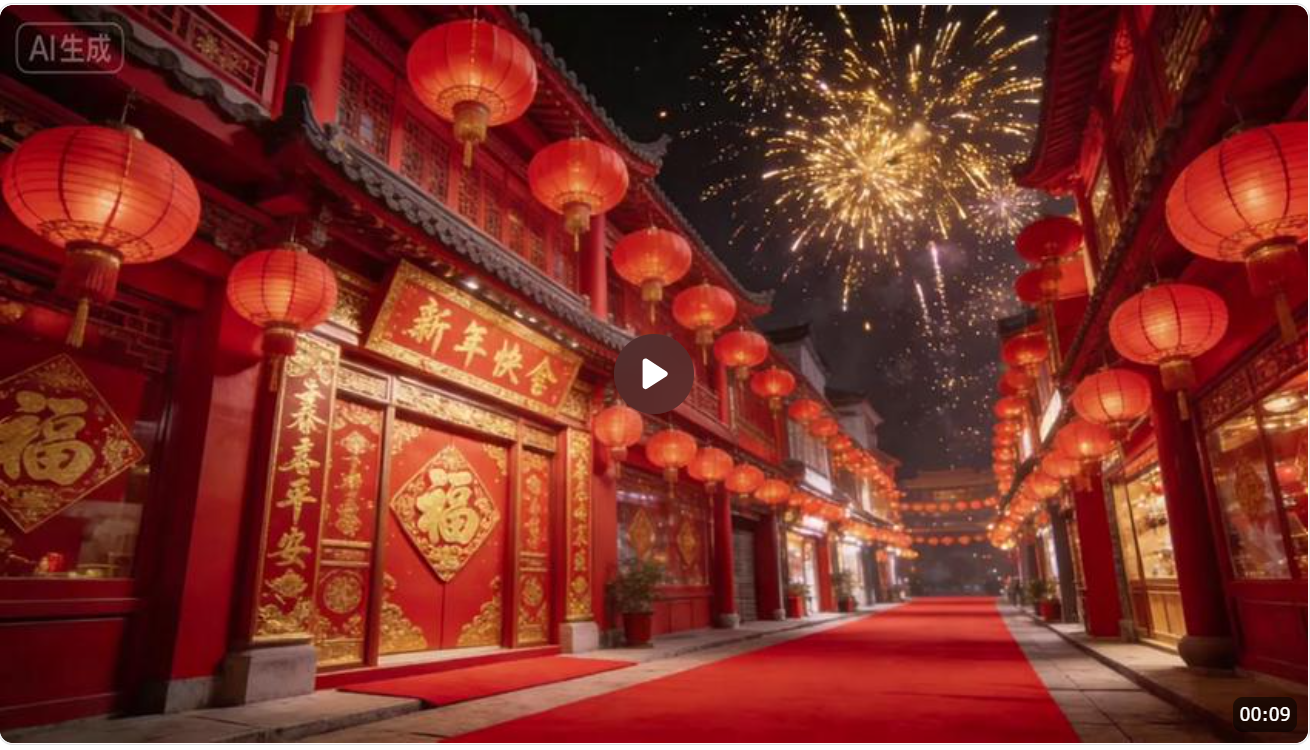 新年活动开场视频 | 场景:红色喜庆街景 → 镜头1:Logo出现 → 镜头2:现场布置 → 镜头3:活动倒计时