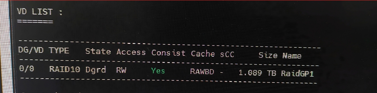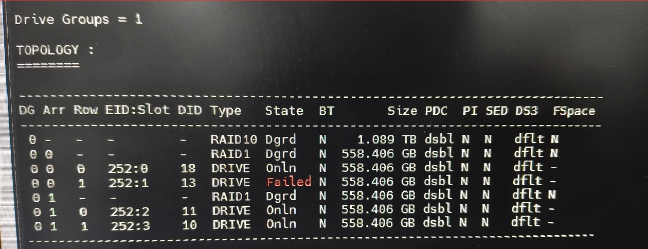 本次故障是 4 盘 RAID10 阵列的槽位 252:1 物理盘失效,导致整个阵列降级:通过执行storcli64 /call show all命令查看拓扑信息,能直接看到磁盘组 0 下的 RAID10 虚拟盘状态为 “Dgrd(降级)”,其包含的 2 个 RAID1 镜像对子阵列也同步降级;进一步看物理盘行,可明确槽位 252:1 对应的磁盘状态显示 “Failed(故障)”,其他 3 块盘(槽位 252:0、252:2、252:3)均为 “OnLn(在线)”,以此定位到故障盘并确认阵列降级原因。