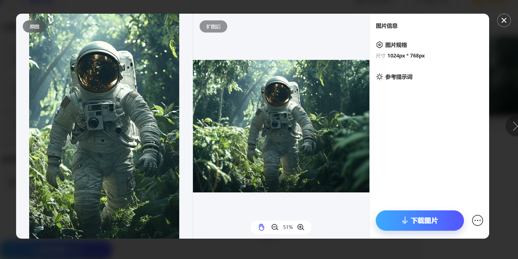 在测试中,对于复杂室内场景的扩展,百度AI图片助手能够保持透视关系的一致性;对于有明确主题的图像,它能够理解场景语义,生成逻辑连贯的扩展内容。
