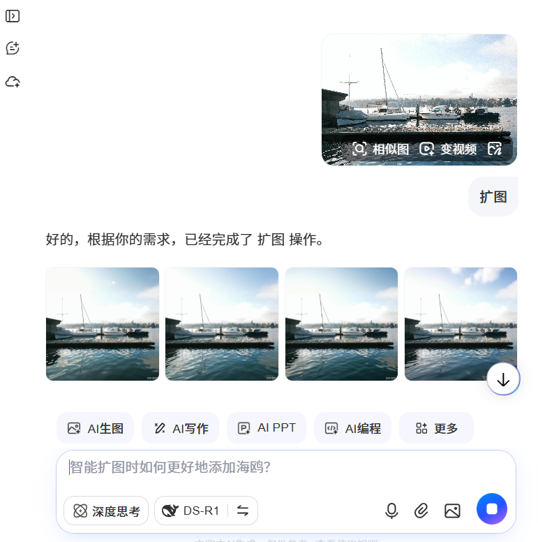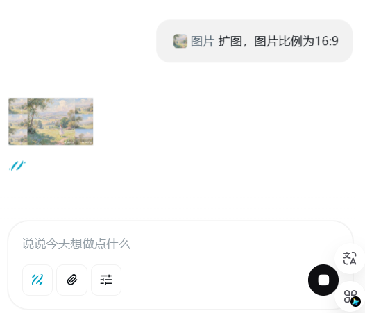 实测体验:与其他工具不同,百度AI图片助手右侧为上传图片和设置的区域,左侧则是输入指令的区域。扩图之后如果有更多需求,可以输入指令,AI会根据指令生成相应内容。