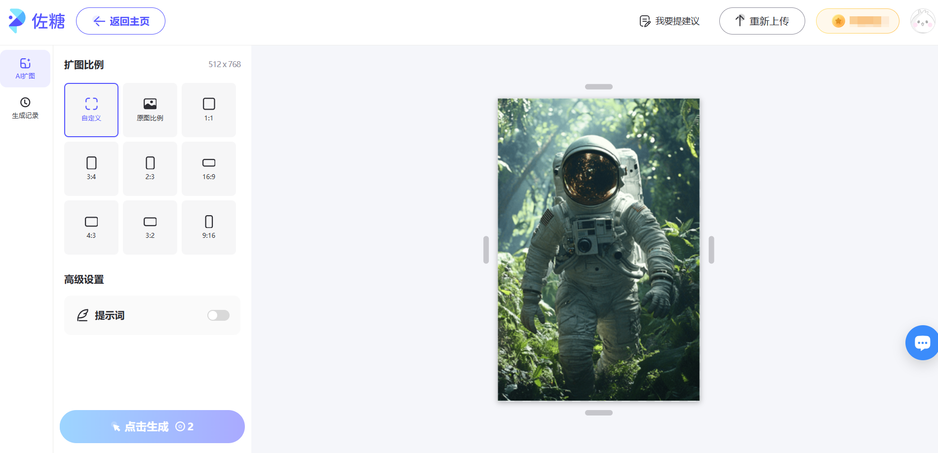 实测体验:上传一张需要扩展的图片后,佐糖会智能分析图像内容,提供多个扩展比例选项(1:1、3:4、自由比例等)。选择扩展比例后,系统在几秒内完成处理,整个过程无需手动干预。