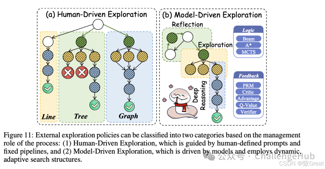 - 广泛探索(Extensive Exploration):长链推理要求模型能够生成并探索更多的不确定逻辑节点,从而扩大推理的边界。例如,一些研究通过蒙特卡洛树搜索(MCTS)和自适应树搜索(Adaptive Tree Search)来增强模型的探索能力。