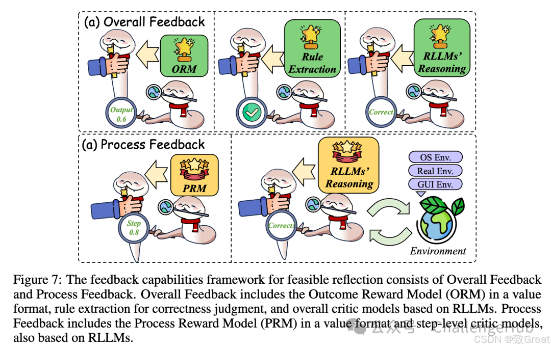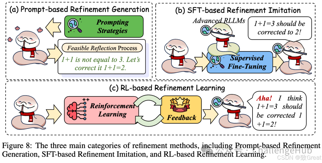 - 可行的反思(Feasible Reflection):长链推理还需要模型能反馈和修正推理过程中的错误。有些研究通过引入自监督学习和强化学习,增强了模型的反思能力。