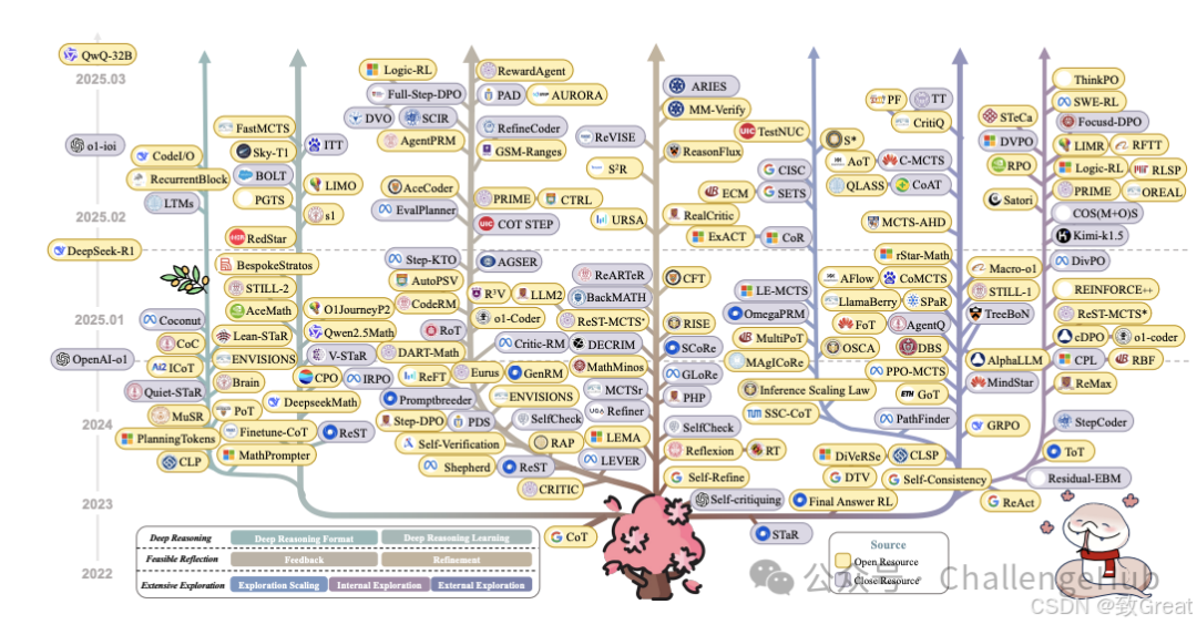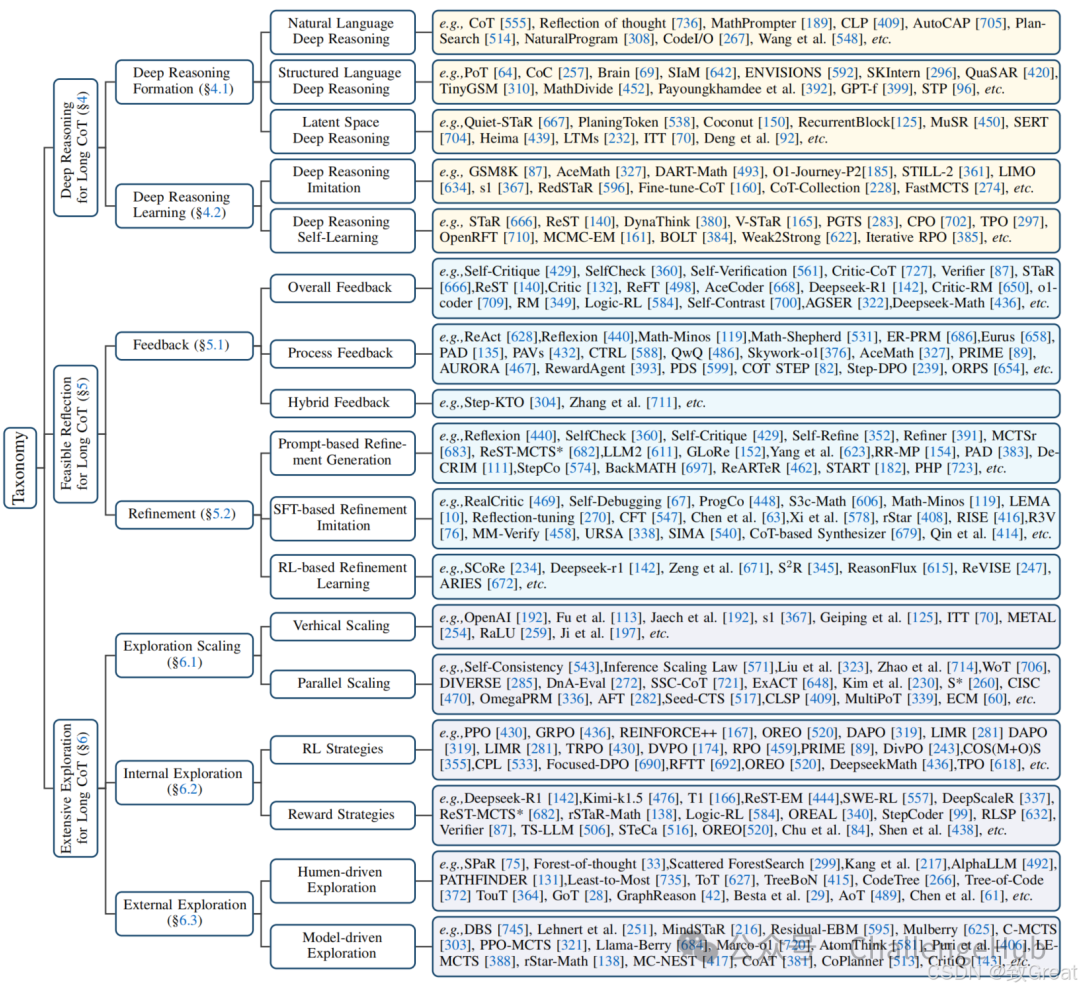 - 长链推理(Long CoT):近年来,研究的重点逐渐转向长链推理,这种推理方式更注重通过深入的逻辑分析和多步骤的推理来解决复杂问题。例如,OpenAI的O1模型和DeepSeek的R1模型就展示了在数学和编程任务中的显著进步。