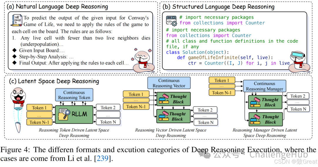 - 深度推理(Deep Reasoning):深度推理涉及更复杂的逻辑处理,需要模型处理更多的逻辑节点。有些研究通过引入自然语言、结构化语言和潜在空间推理,增强了模型的深度推理能力。