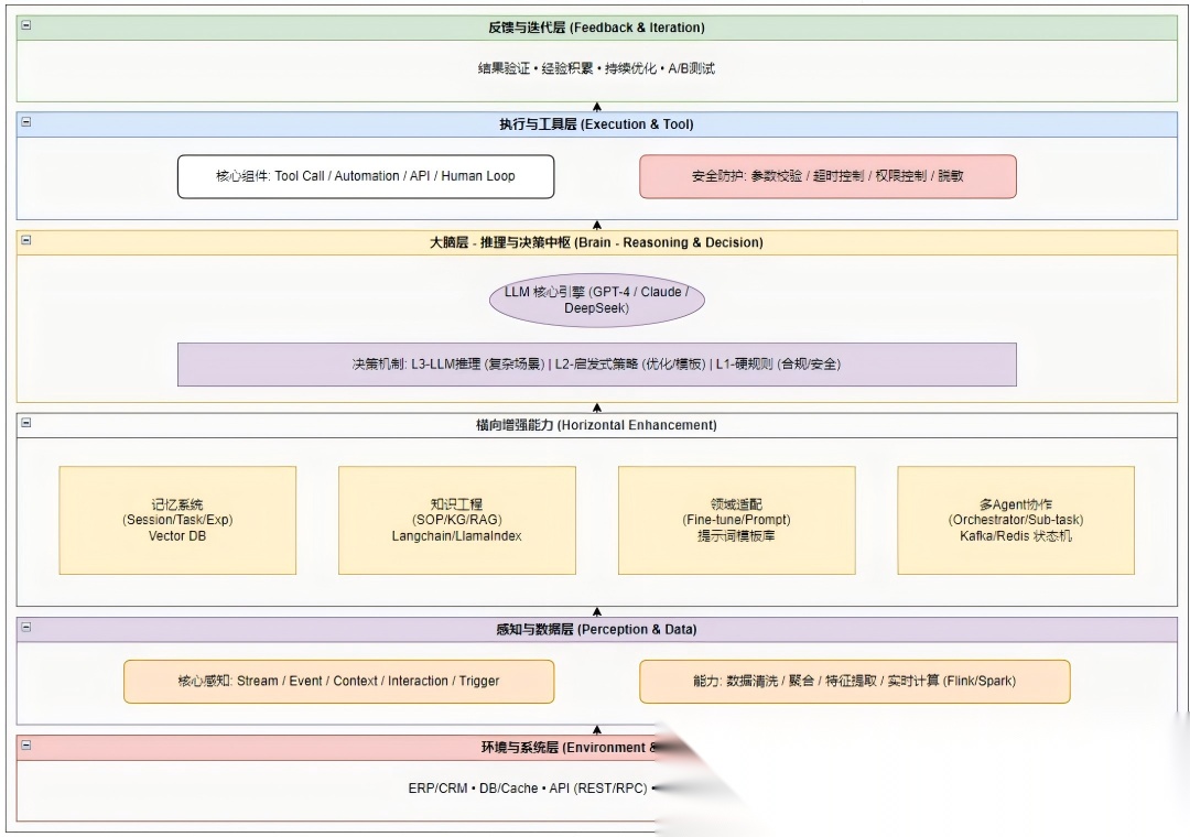 - 认知与决策层(大脑):理解任务、分解步骤、结合检索增强生成(RAG)获取知识、进行逻辑推理与策略规划。