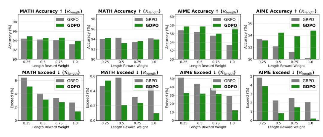 - GDPO配合条件化奖励,在AIME上准确率提升4.4%,同时长度超标率反而降低16.9%