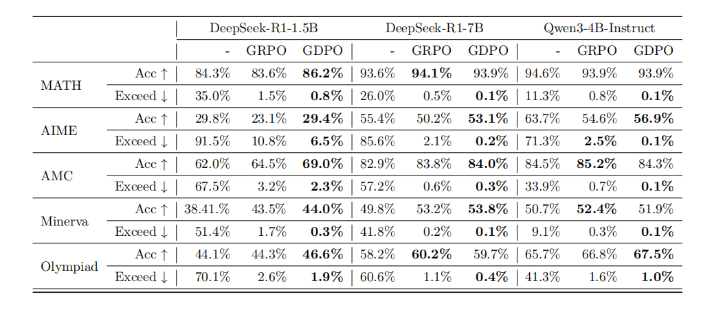 - DeepSeek-R1-7B:GDPO在AIME上准确率提升近3%,长度超标率从2.1%降到0.2%
