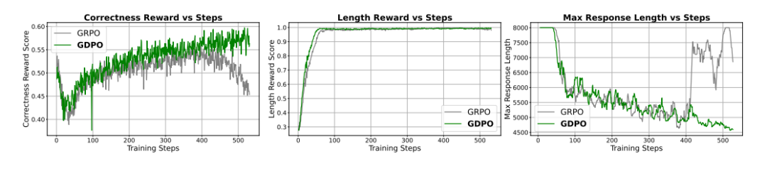 - GDPO全程保持稳定,正确性持续提升,响应长度控制得更好