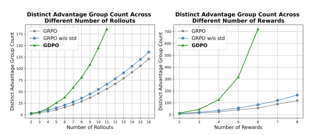 从图3可以看到定量对比:随着rollout数量或奖励数量增加,GDPO保留的不同优势组数量远超GRPO和移除标准差的GRPO变体。这意味着GDPO提供了更丰富、更精确的训练信号。