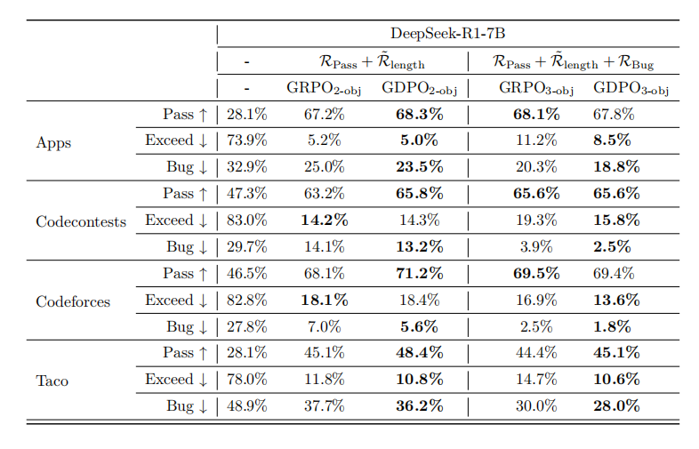 - 三目标设置:GDPO保持相似的通过率,但在长度超标率和bug率上都显著优于GRPO(如Codecontests的bug率从3.9%降到2.5%)