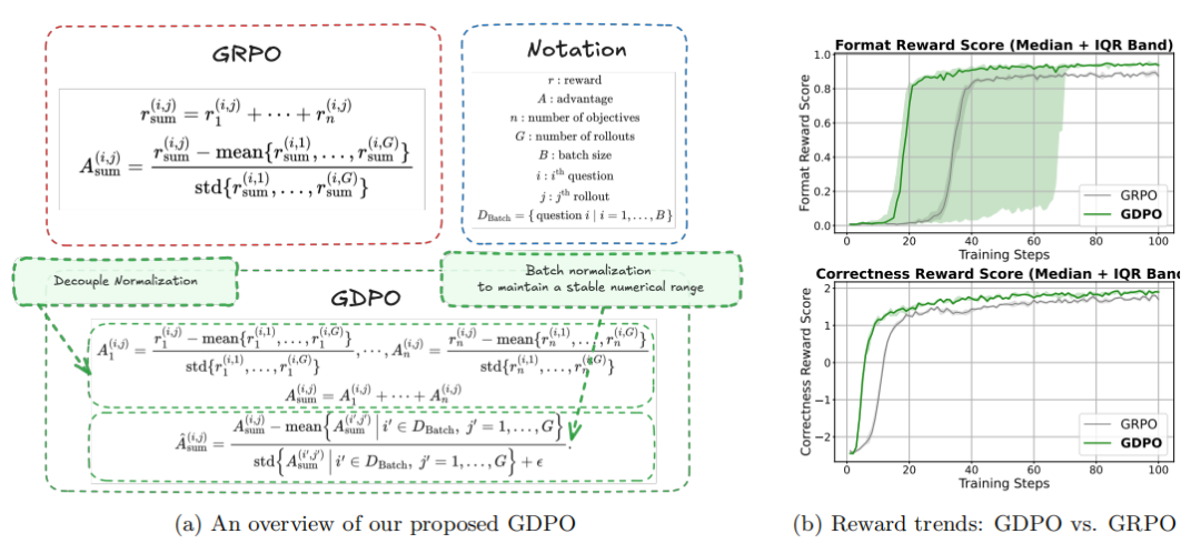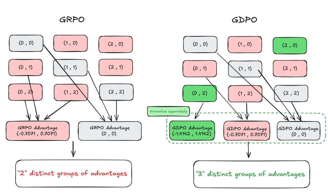 GDPO的核心洞察非常简单:不要先把不同奖励混在一起再归一化,而是先分别归一化每个奖励,再组合起来。这个看似微小的改变,却能保留奖励之间的细微差异,避免信号坍缩,从而带来更稳定的训练和更好的性能。