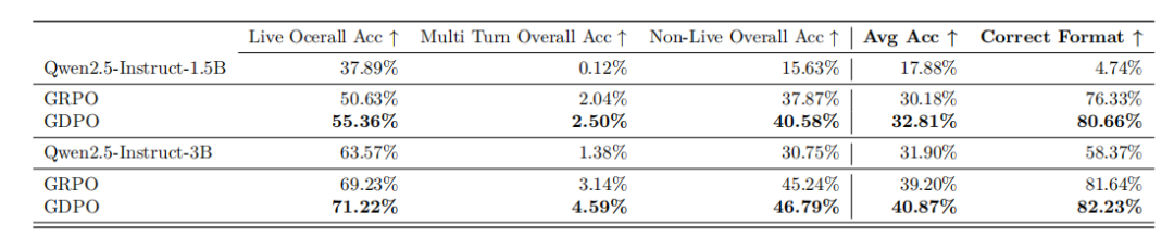 - Qwen2.5-3B:GDPO在所有子任务上都优于GRPO,Live/Non-Live任务准确率提升约2%,格式正确率提升0.6%