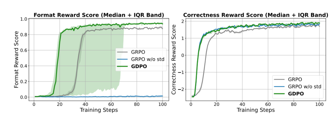 - 虽然GDPO在格式奖励上收敛步数方差较大,但最终都能达到比GRPO更好的效果