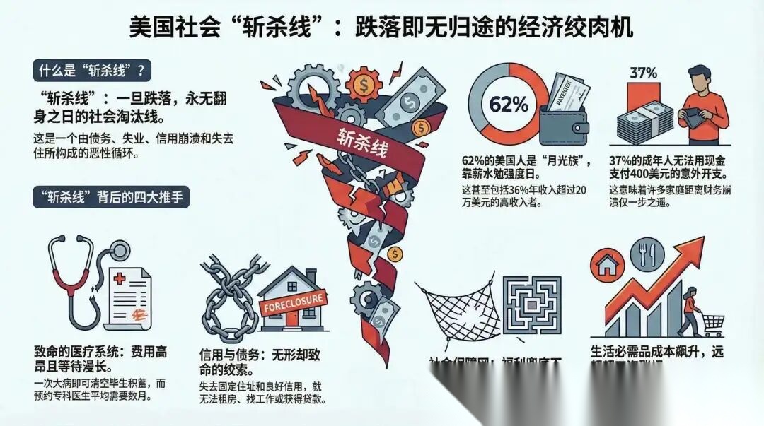 一旦越过这条线,就会触发毁灭性的连锁反应:账单逾期 → 信用破产 → 失去住所 → 丢掉工作 → 生活彻底崩盘。