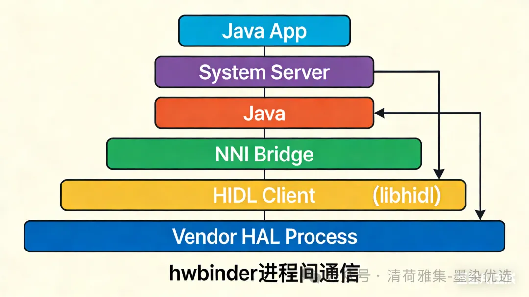 [Java App]↓[System Server / Custom Manager (Java)]↓ (JNI)[JNI Bridge]↓ (HIDL Client in libhidl)[Vendor HAL Process (via hwbinder)]