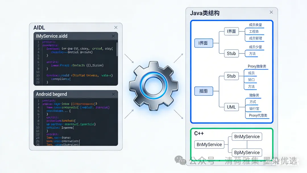 “接口声明即跨语言通信实现” —— 开发者只需定义 AIDL,编译系统自动生成 Java Proxy、C++ Stub、JNI Bridge 与序列化优化路径。