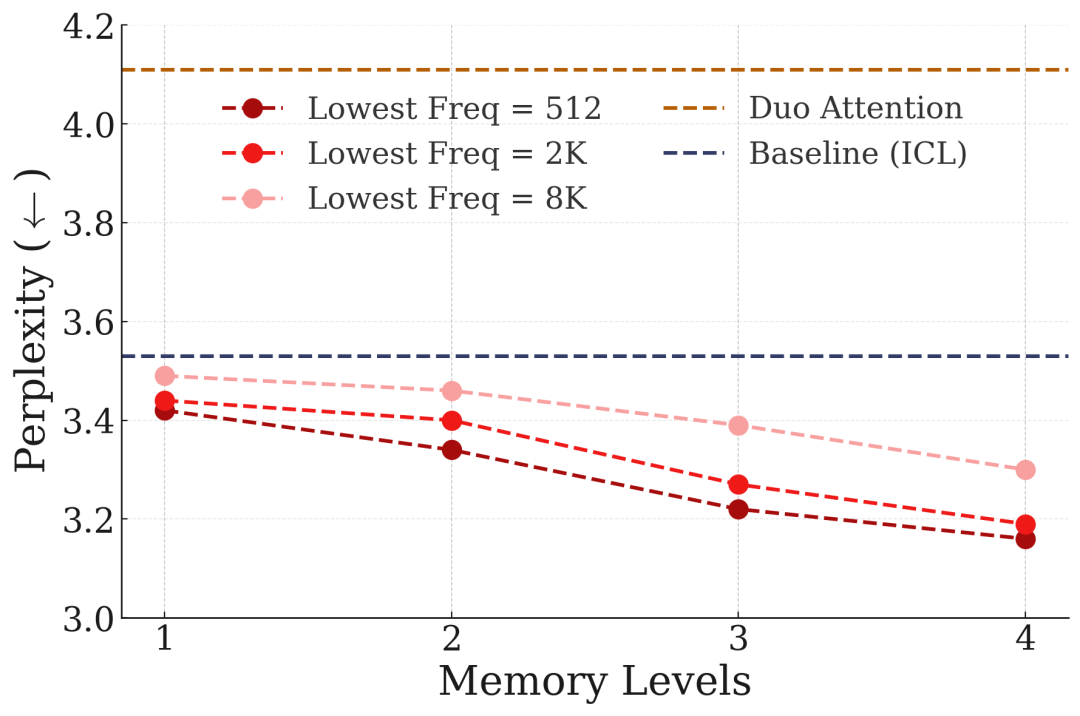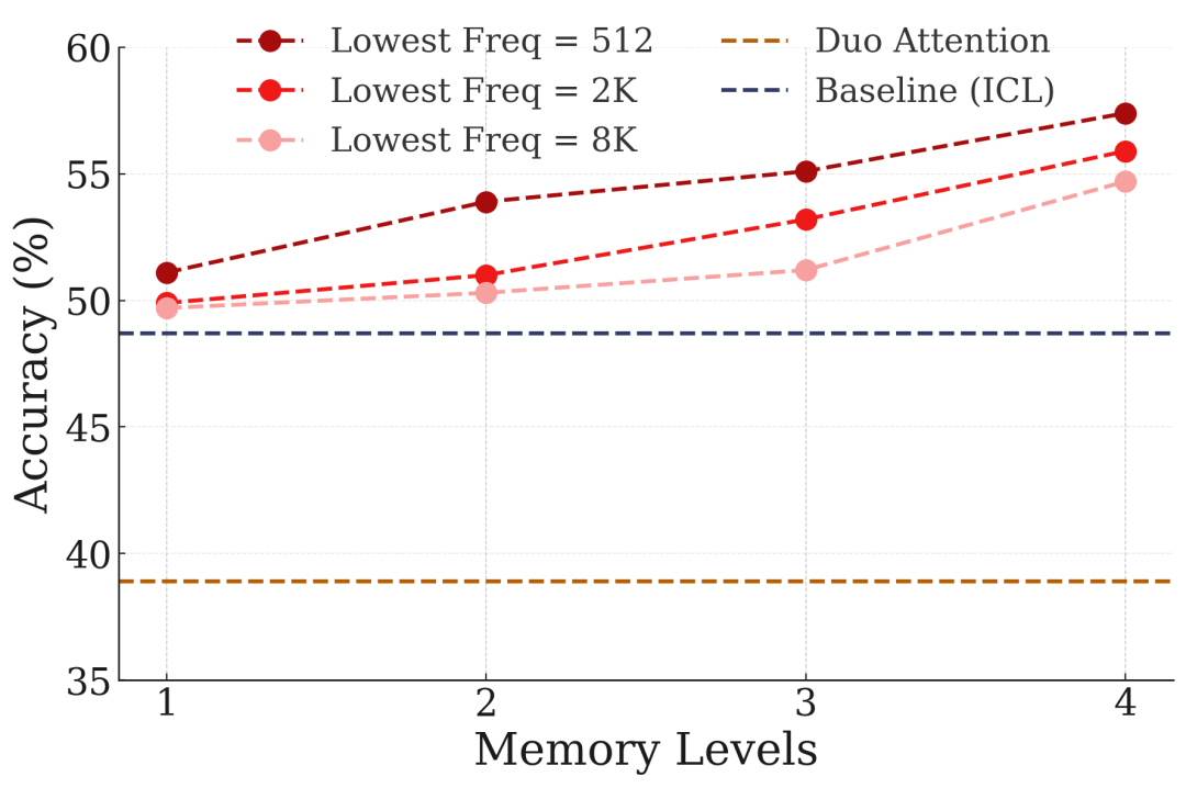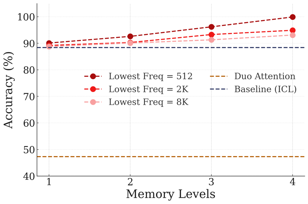 图11:记忆层级数量对NIAH任务性能的影响。更多层级带来更好的长期记忆和长上下文理解能力。