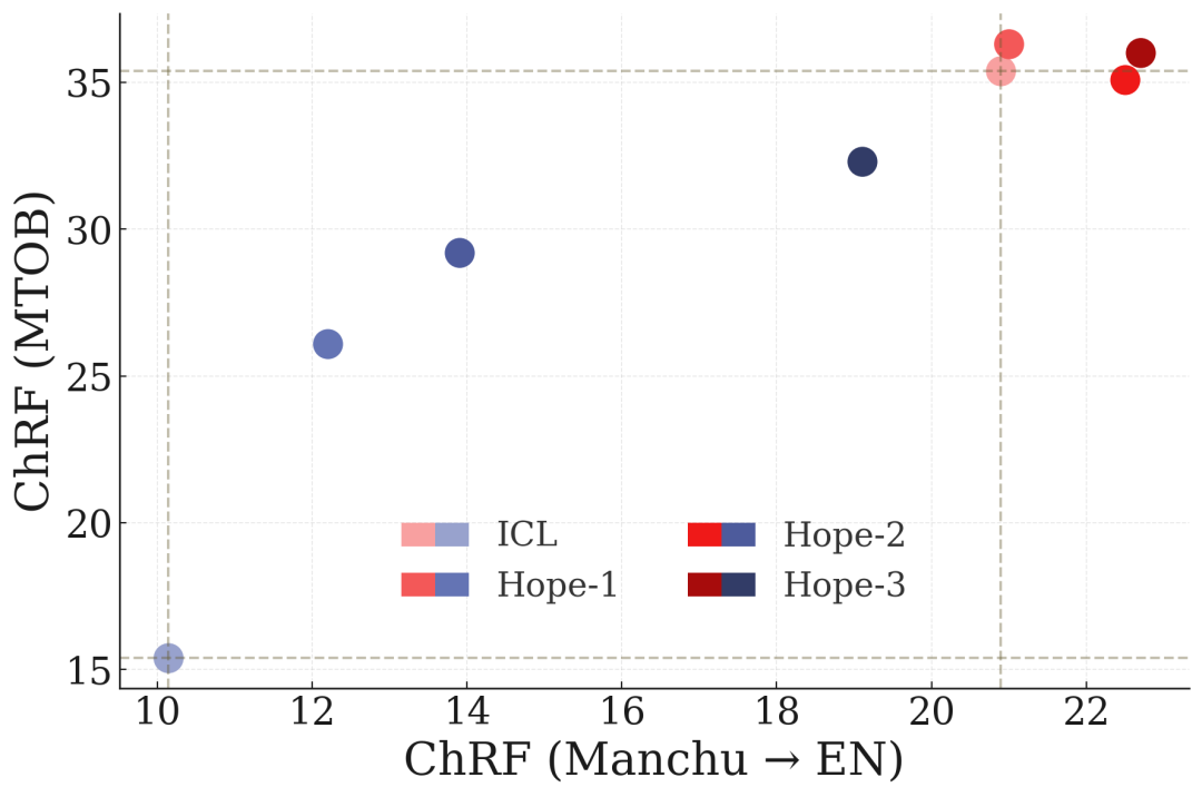 图7:持续翻译新语言(CTNL)任务。红色点是单语言结果,蓝色点是持续学习场景结果。HOPE-3几乎恢复了非持续学习场景下的ICL性能,展示了其强大的抗遗忘能力。