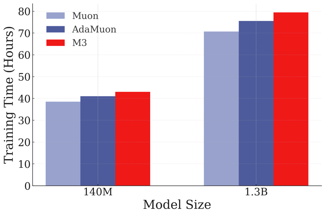 图17:不同优化器的训练时间对比。M3在保持高性能的同时,训练效率也具有竞争力。
