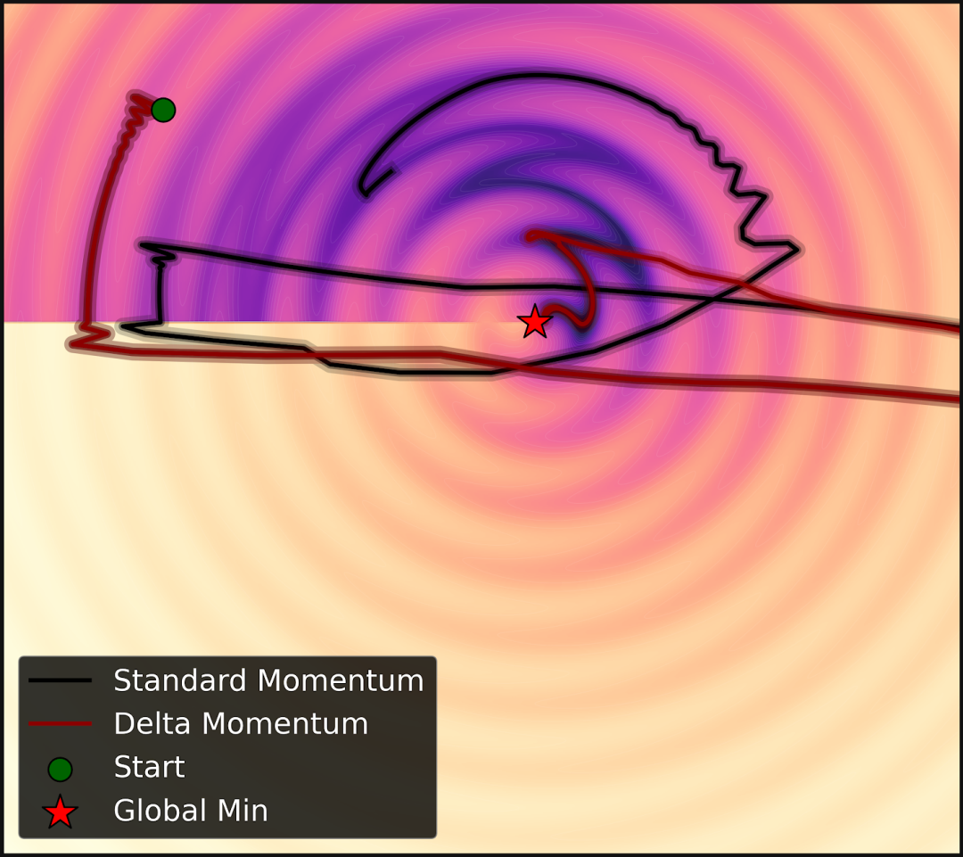 图3:使用标准动量和Delta动量优化函数ψ(r,θ)的对比。Delta动量由于其依赖梯度的权重衰减,能够更快找到解。这展示了将优化器视为关联记忆后,可以设计出更高效的更新规则。
