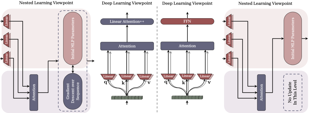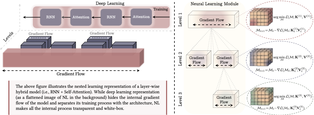 图2:嵌套学习范式将机器学习模型表示为一组嵌套的优化问题。(左)混合架构示例:深度学习视角只能看到扁平的结构,而NL透明地展示了所有内部梯度流。(右)神经学习模块:一个学习如何压缩自身上下文流的计算模型。