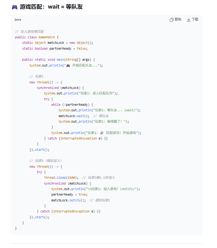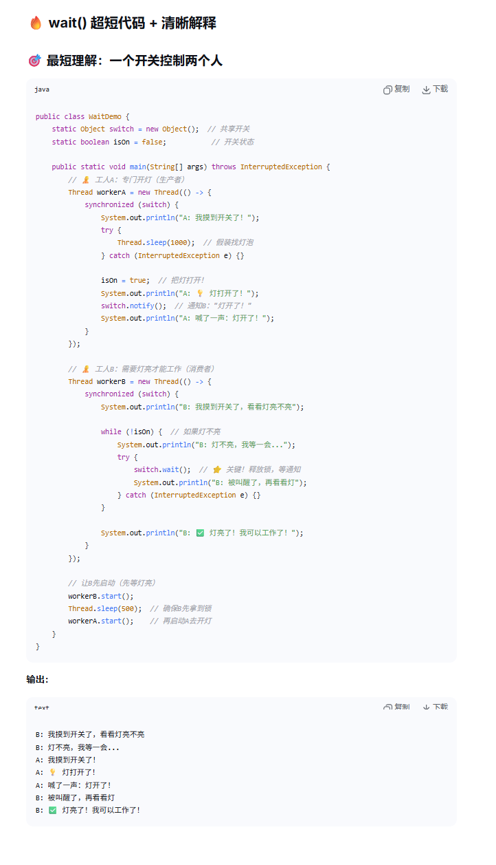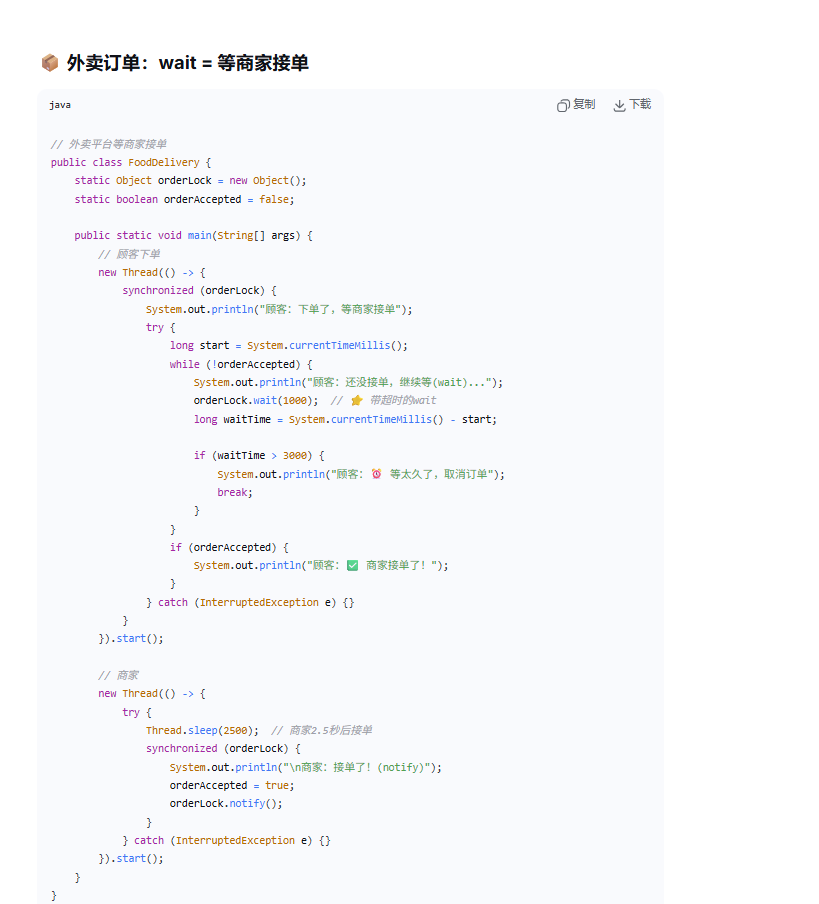 (5)wait一般是结合notify使用,目的在于安排执行顺序和避免“线程饥饿”