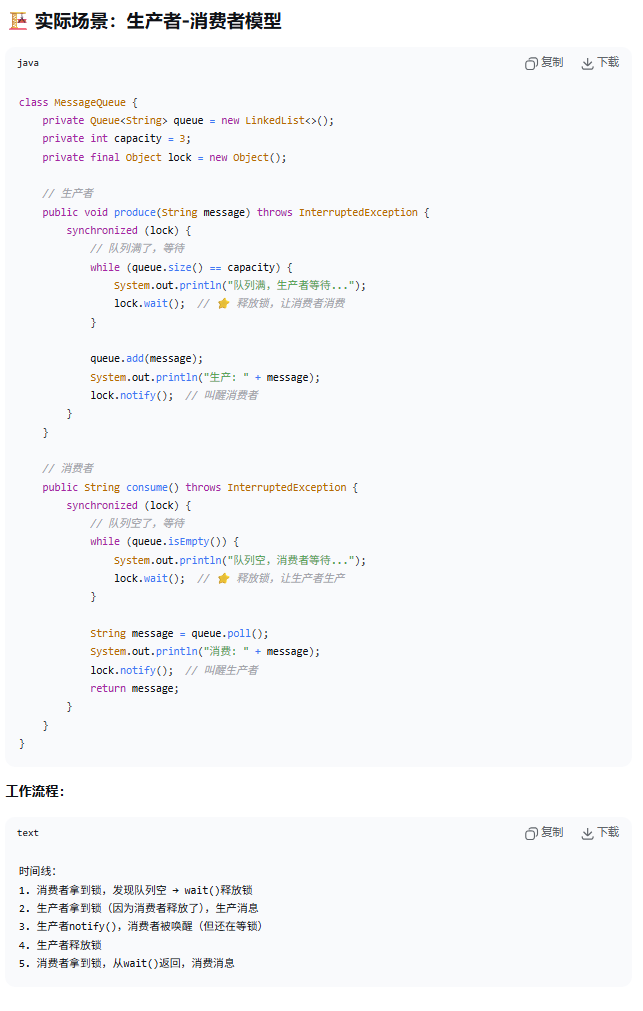 ▶场景举例:有两个线程t1和t2,这时候希望t1先执行完某个逻辑之后再让t2去执行,此时就可以先让t2去wait主动进行阻塞等待,注意此时t2是不占用锁资源的,而是释放锁让t1去获取到锁,此时t1就可以去完成它的任务,等到t1完成任务后使用notify方法唤醒t2,那么t2被唤醒了才继续往下执行它的任务