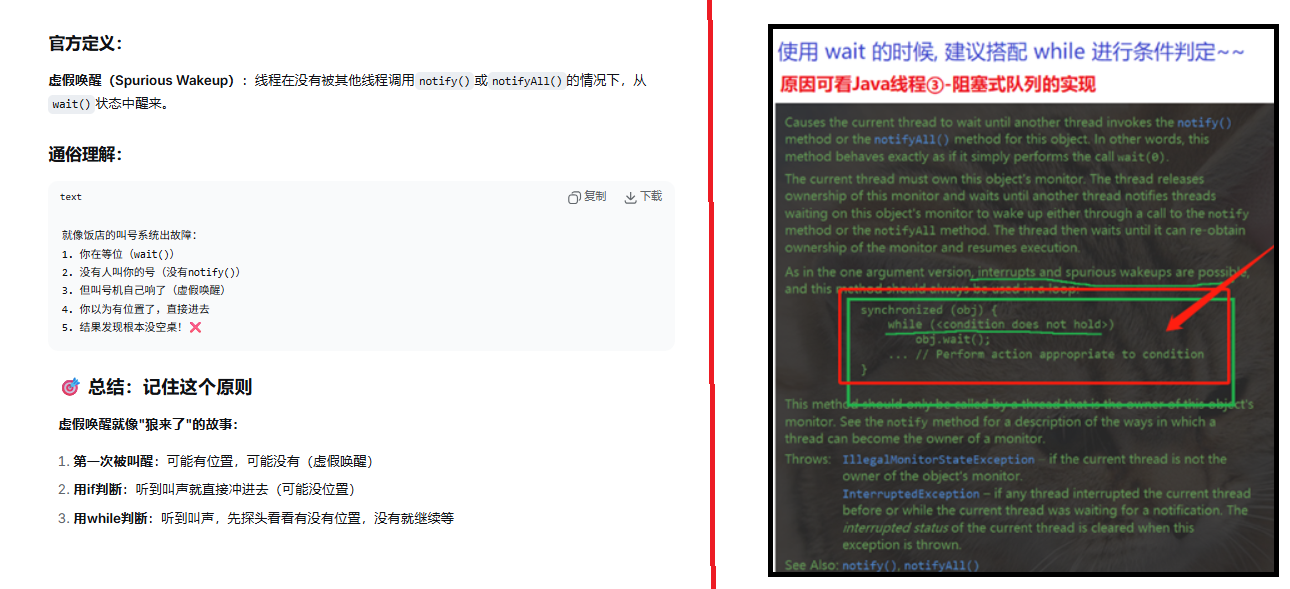 虚假唤醒(Spurious Wakeup):线程可能在没有被notify的情况下自己醒来,这是操作系统层面的特性。所以必须用while循环再次检查条件,因为if不像while重新去判断条件,如果用if的话就算不满足条件它也继续往下执行了