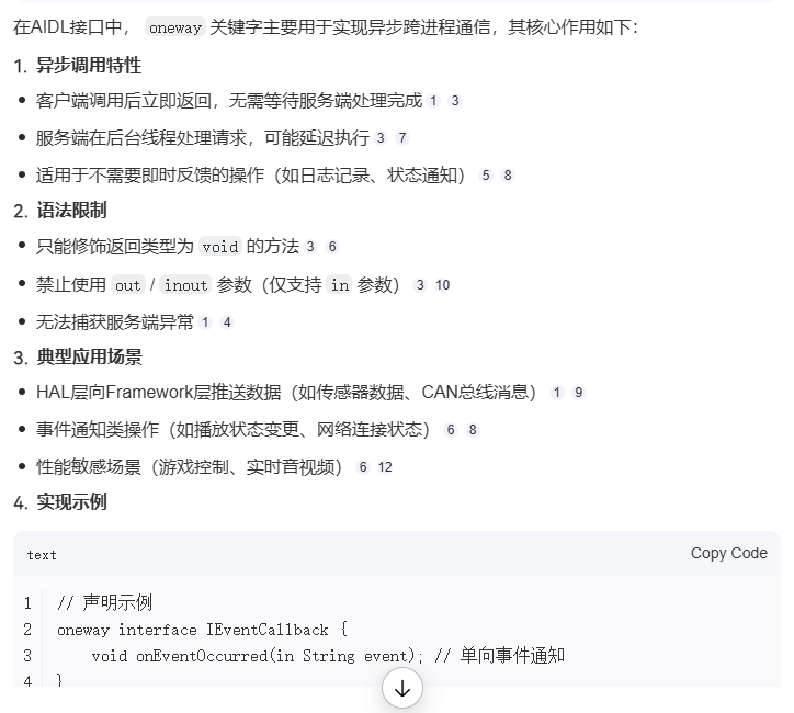 //oneway方法会异步调度,并且无法返回结果。从同一线程到同一 binder 的单向方法也会按顺序执行(但可能会在不同线程上执行)。如需查看有关如何设置线程的讨论,请参阅 AIDL 后端线程管理。