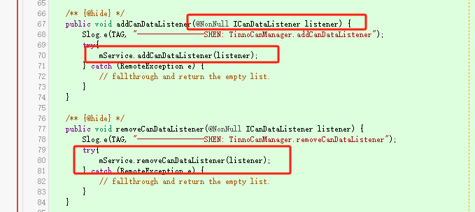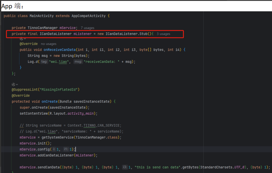 如上创建了两个aidl文件,其中ITinnoManager.aidl作为主接口,ICanDataListener.aidl作为被ITinnoManager.aidl引用的回调接口,后续详细介绍回调接口。