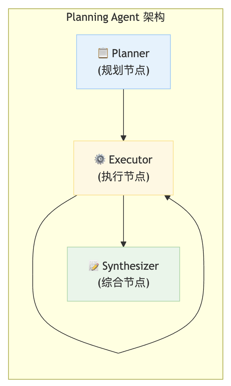 Planning 架构遵循 "接受任务 → 创建计划 → 执行计划 → 合成结果" 的线性流程: