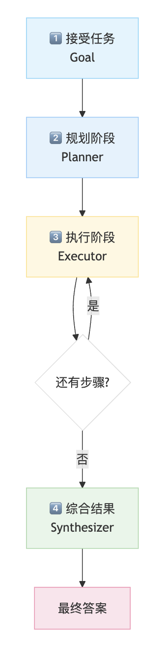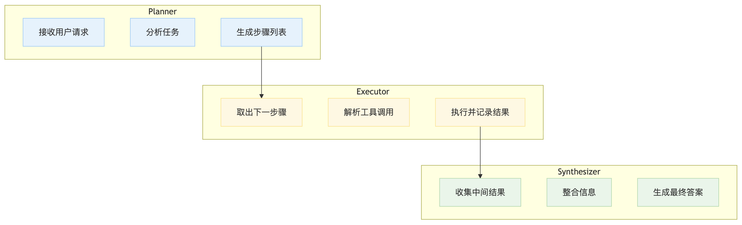 | Executor | 取出下一步骤 | 解析工具调用 | 执行并记录结果 |