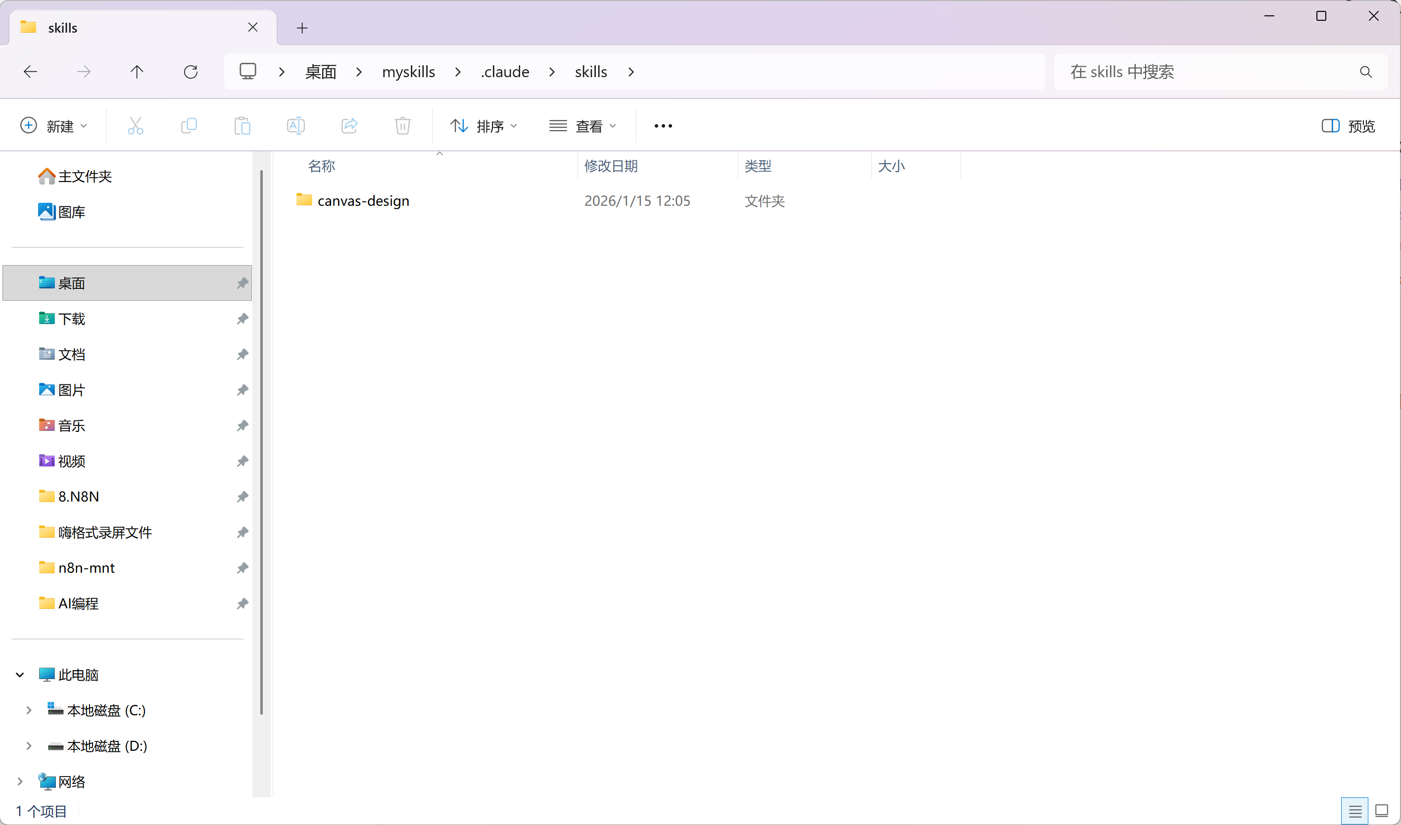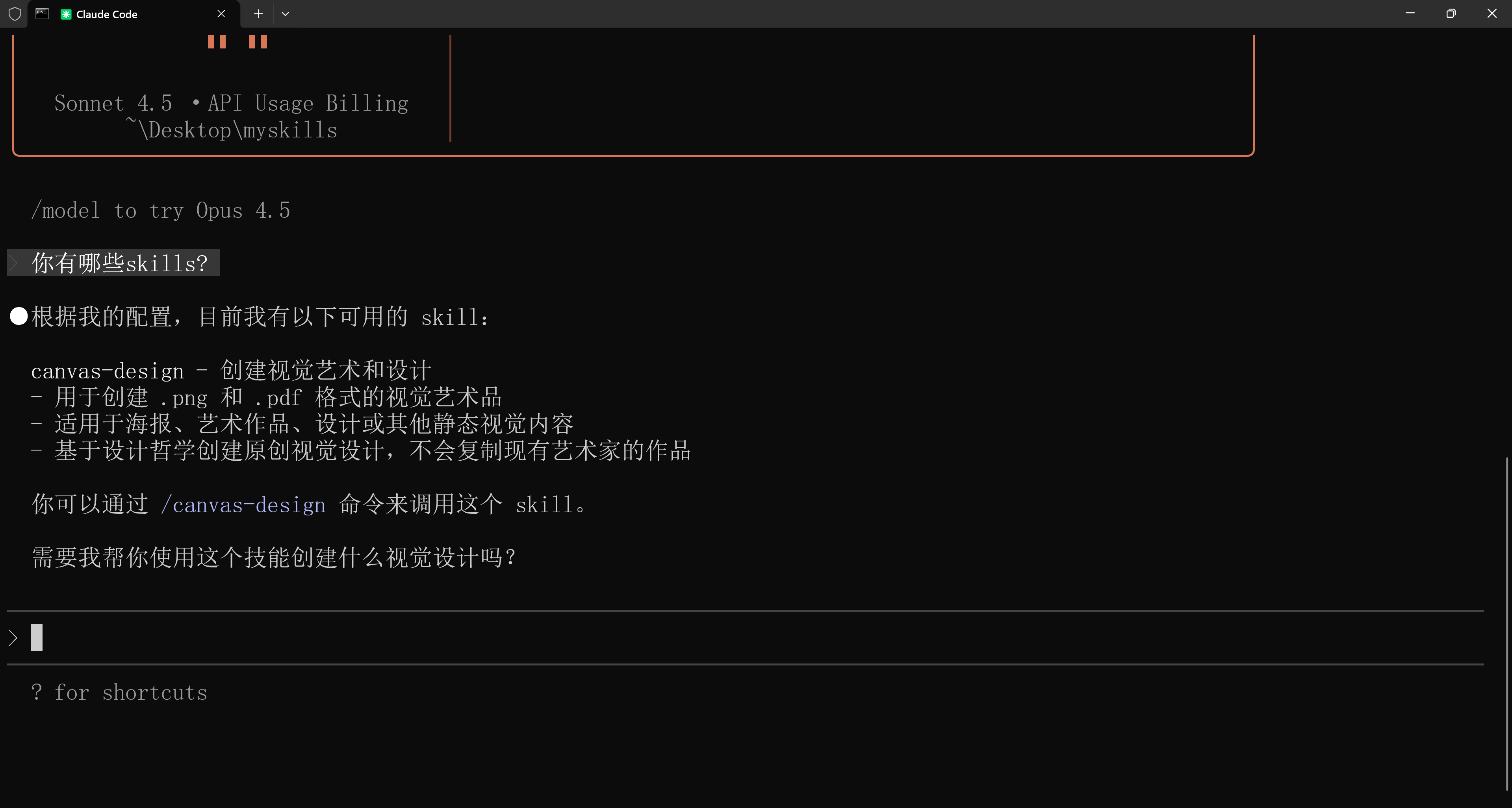 在你的项目文件夹下,创建一个特定的目录结构:myskills/.claude/skills