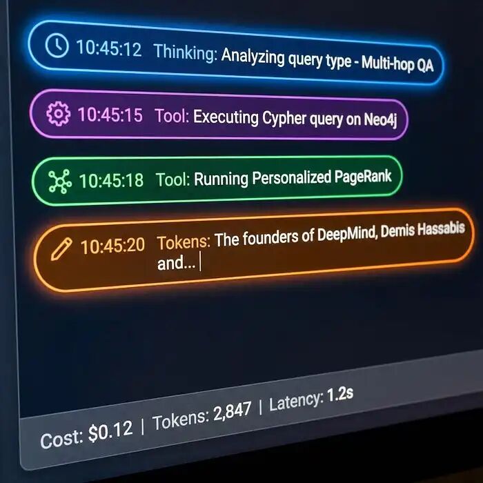 StreamingRouter(流式路由器) 旨在消除 AI 系统中的“黑盒”问题。系统不是显示加载转圈图标,而是实时流式传输推理过程。用户可以看到思考事件(查询分析、策略选择)、工具事件(数据库操作)、Token 事件(答案生成)和元数据(成本、延迟、来源)。这种透明性建立信任——用户理解为何获得特定答案及其成本。流式处理也降低感知延迟;用户与部分结果交互,而非等待完成。