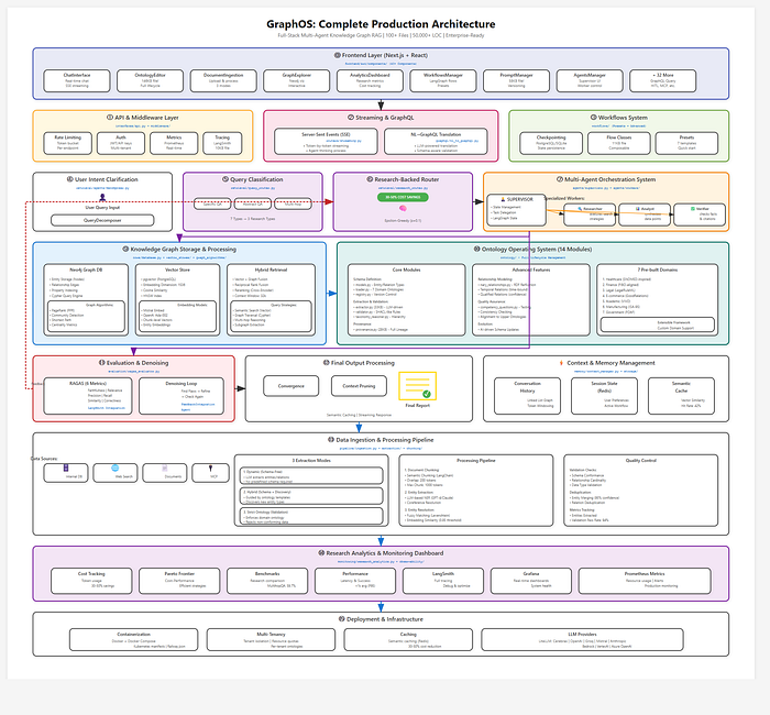 GraphOS 是一个基于 Neo4j、LangGraph、LiteLLM 以及完整监控栈构建的、面向生产的完整检索增强生成(RAG)平台。它旨在处理企业级规模的知识图谱操作,同时保持完整的可观测性和成本优化。该架构可分为十五个主要层级:前端界面、中间件栈、流式处理与 GraphQL 层、工作流编排层、查询处理流水线、多智能体系统、检索策略层、知识图谱存储层、本体操作系统、评估层、输出处理层、数据摄取流水线、分析仪表盘以及部署基础设施。