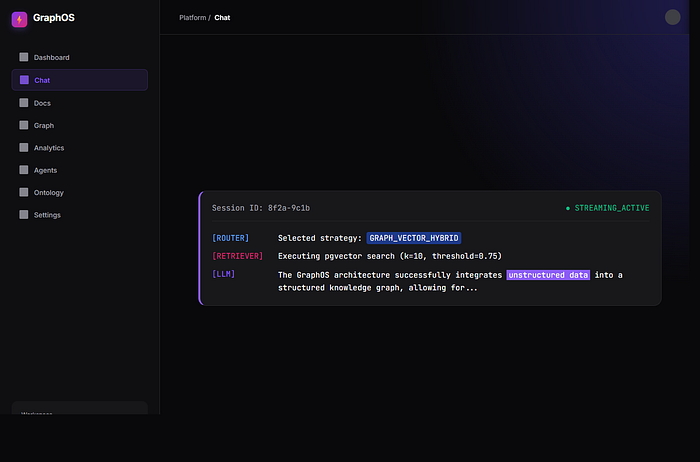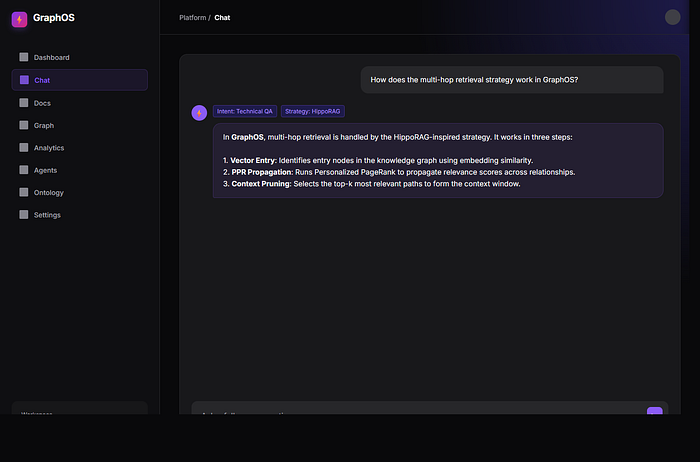 ChatInterface(聊天界面) 旨在透明地展示系统的推理过程。它不是显示一个加载转圈图标,而是通过 Server-Sent Events(SSE)实时流式传输系统思考过程。用户可以清楚看到系统正在进行的操作:分析查询、选择检索策略、执行图操作,并逐个 Token 生成最终答案。这种透明性建立信任,并降低复杂多跳查询的感知延迟。